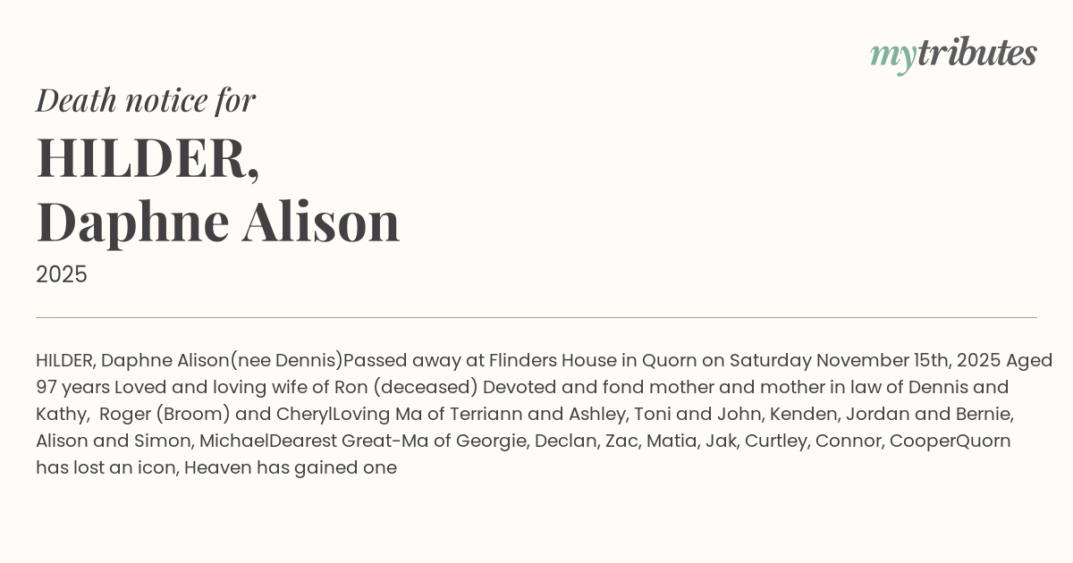 Passed away at Flinders House in Quorn on Saturday November 15th, 2025
