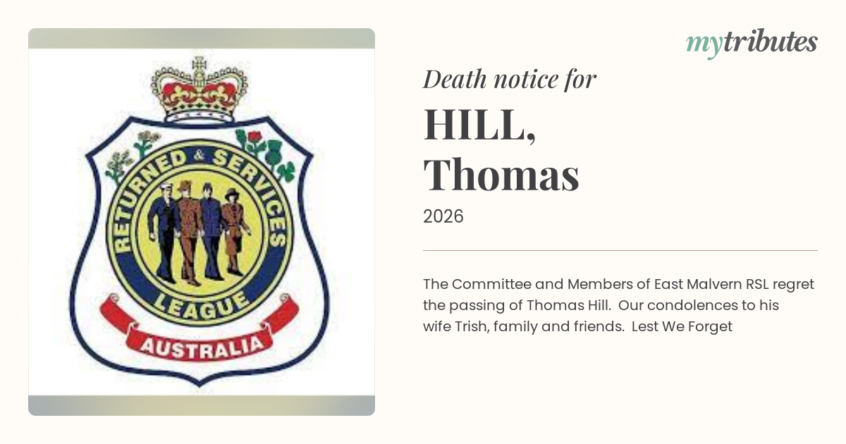 The Committee and Members of East Malvern RSL regret the passing of Thomas Hill. Our condolences to his wife Trish, family and friends.