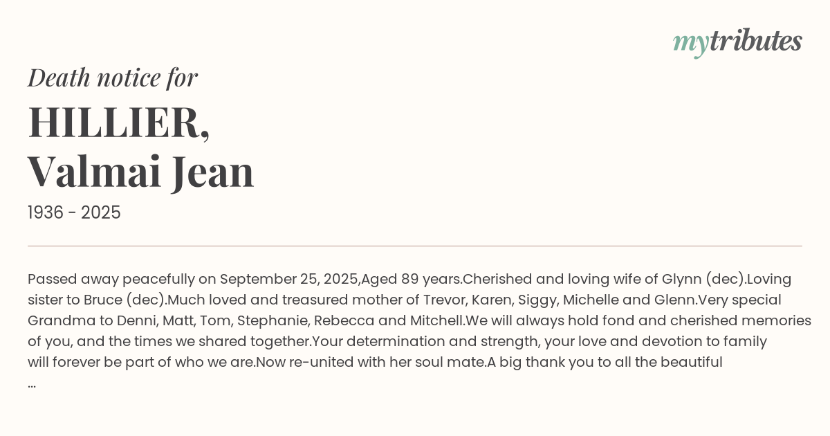 Much loved and treasured mother of Trevor, Karen, Siggy, Michelle and Glenn.