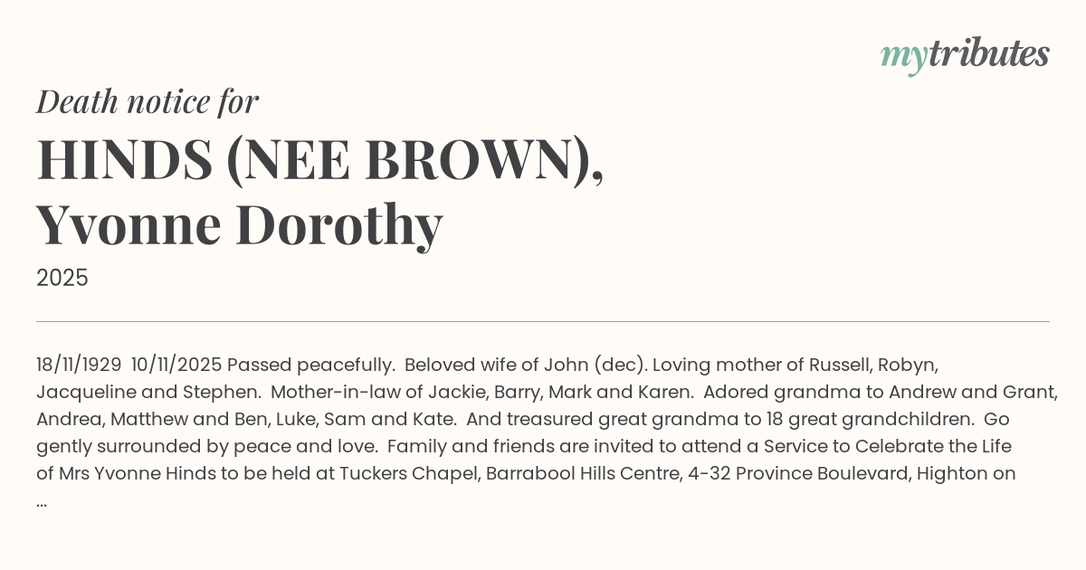 Family and friends are invited to attend a Service to Celebrate the Life of Mrs Yvonne Hinds to be held at Tuckers Chapel, Barrabool Hills Centre, 4-32 Province Boulevard, Highton on FRIDAY (21st November) at 2.00pm prior to a private cremation.
