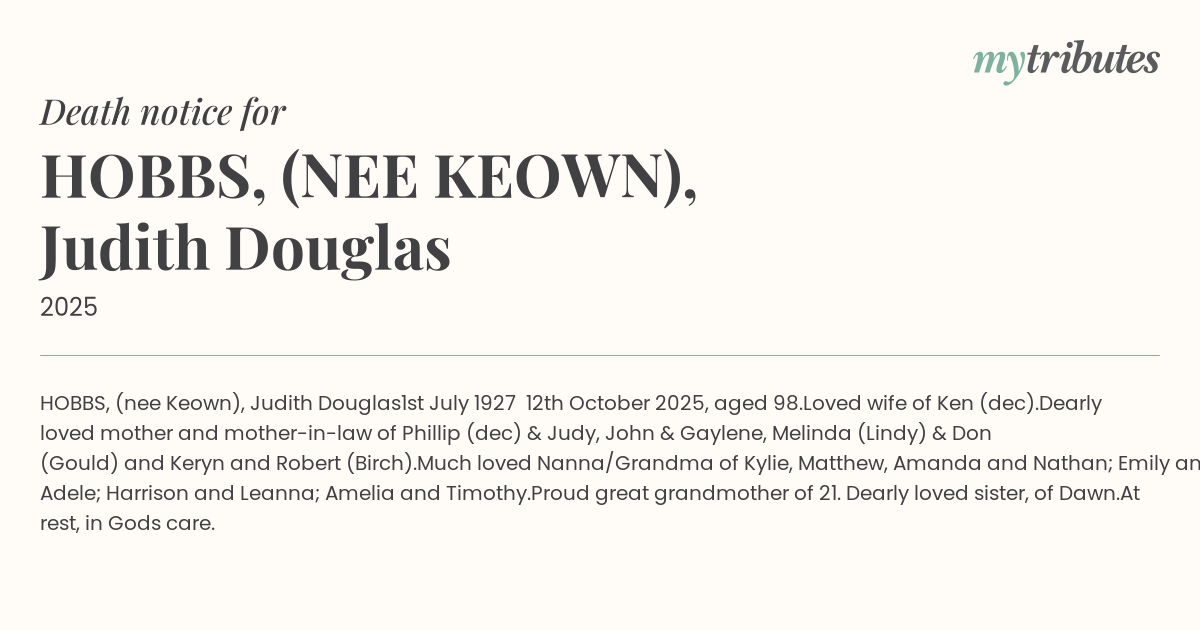 Dearly loved mother and mother-in-law of Phillip (dec) & Judy, John & Gaylene, Melinda (Lindy) & Don (Gould) and Keryn and Robert (Birch).