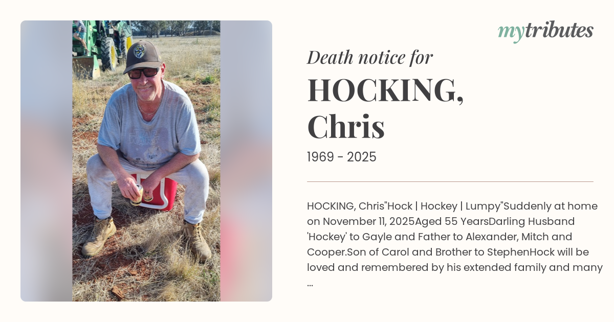 Please visit Hock's memorial site at https://www.funeralsandfarewells.com.au for Funeral details, to stream the service or to leave a tribute.