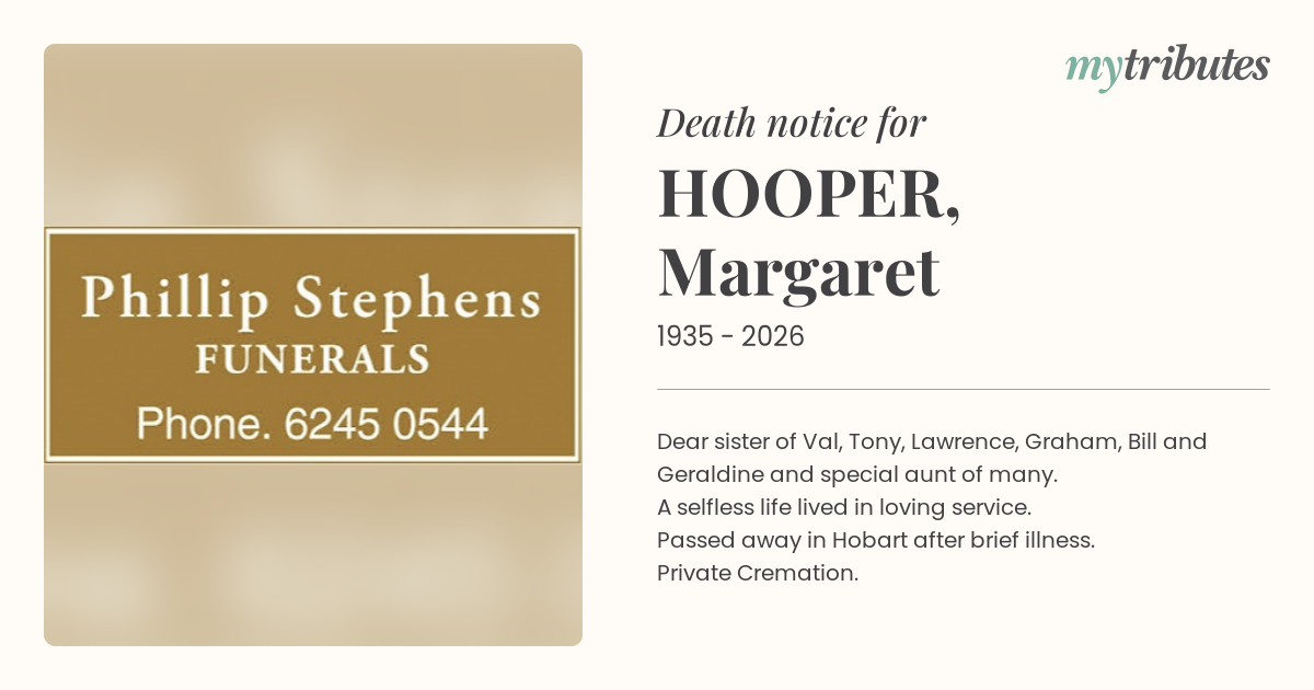 Dear sister of Val, Tony, Lawrence, Graham, Bill and Geraldine and special aunt of many.