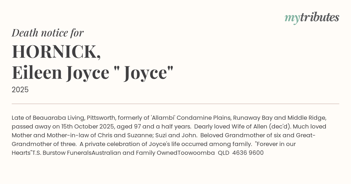 Late of Beauaraba Living, Pittsworth, formerly of 'Allambi' Condamine Plains, Runaway Bay and Middle Ridge, passed away on 15th October 2025, aged 97 and a half years.