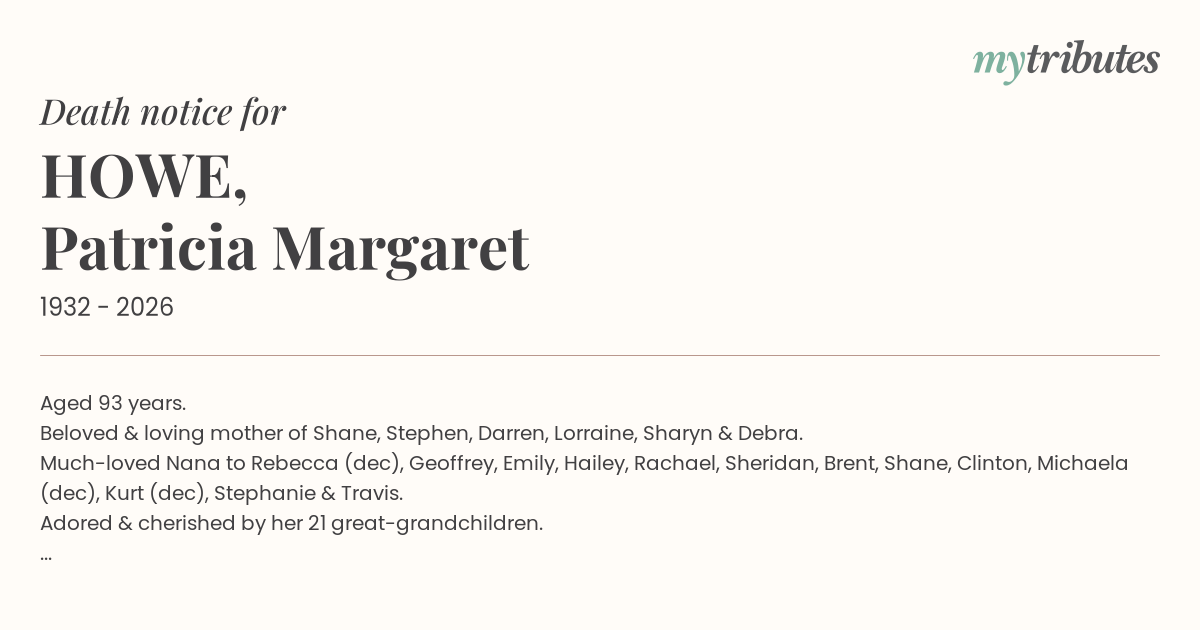 Much-loved Nana to Rebecca (dec), Geoffrey, Emily, Hailey, Rachael, Sheridan, Brent, Shane, Clinton, Michaela (dec), Kurt (dec), Stephanie & Travis.