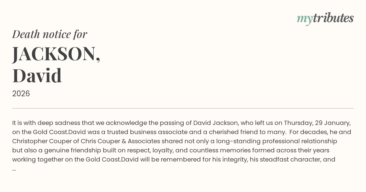 It is with deep sadness that we acknowledge the passing of David Jackson, who left us on Thursday, 29 January, on the Gold Coast.