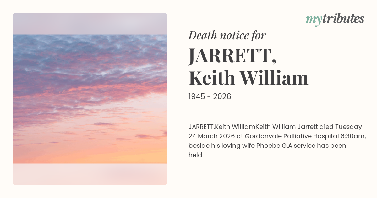 Keith William Jarrett died Tuesday 24 March 2026 at Gordonvale Palliative Hospital 6:30am, beside his loving wife Phoebe G.