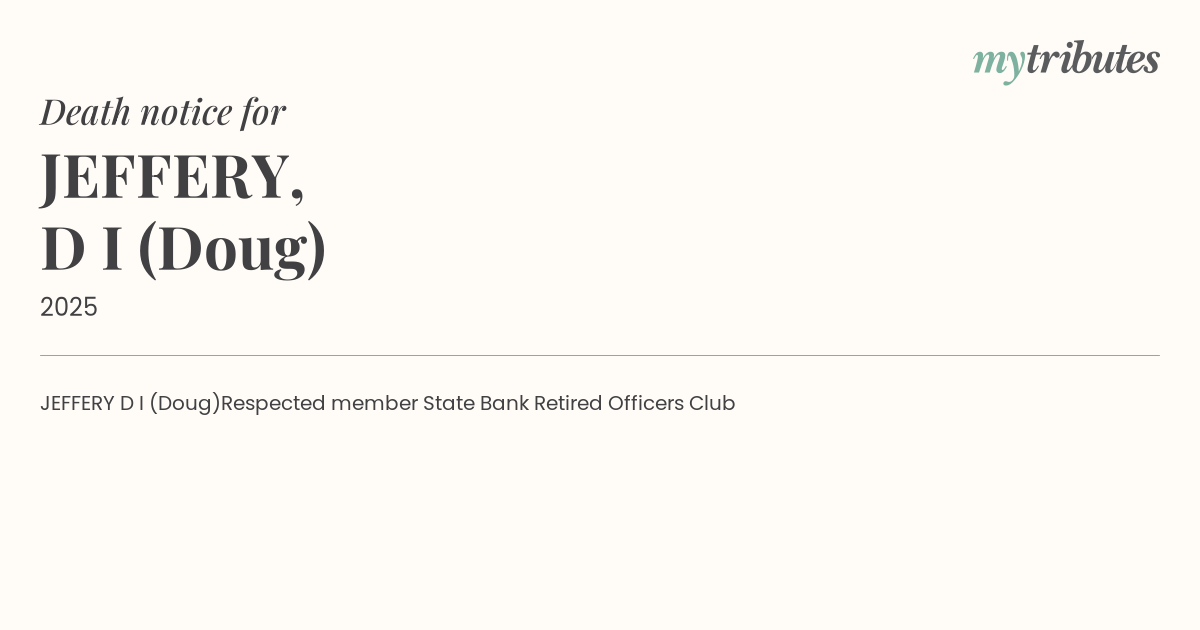 JEFFERY D I (Doug)Respected member State Bank Retired Officers Club