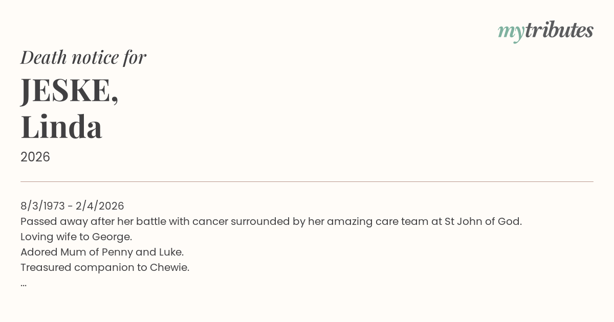 Passed away after her battle with cancer surrounded by her amazing care team at St John of God.