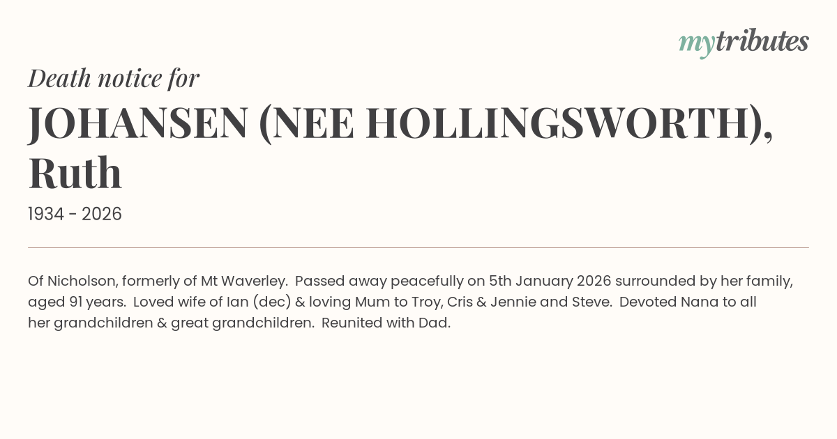 Of Nicholson, formerly of Mt Waverley. Passed away peacefully on 5th January 2026 surrounded by her family, aged 91 years. Loved wife of Ian (dec) & loving Mum to Troy, Cris & Jennie and Steve. Devoted Nana to all her grandchildren & great grandchildren. Reunited with Dad.