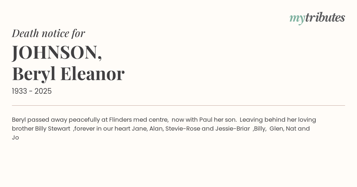 Beryl passed away peacefully at Flinders med centre, now with Paul her son. Leaving behind her loving brother Billy Stewart ,forever in our heart Jane, Alan, Stevie-Rose and Jessie-Briar ,Billy, Glen, Nat and Jo