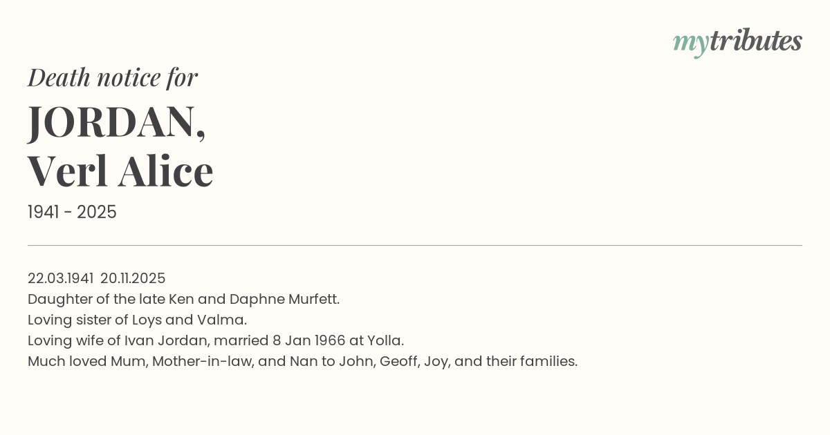 Loving wife of Ivan Jordan, married 8 Jan 1966 at Yolla.