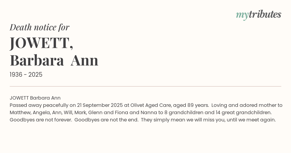 Passed away peacefully on 21 September 2025 at Olivet Aged Care, aged 89 years. Loving and adored mother to Matthew, Angela, Ann, Will, Mark, Glenn and Fiona and Nanna to 8 grandchildren and 14 great grandchildren. Goodbyes are not forever. Goodbyes are not the end. They simply mean we will miss you, until we meet again.
