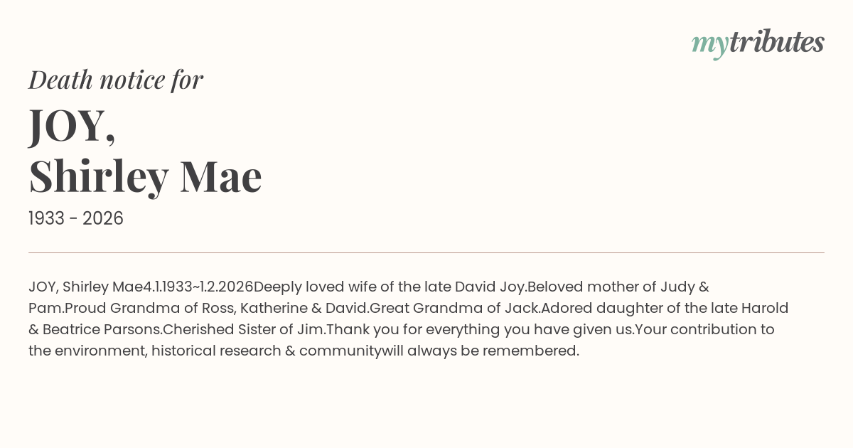 Deeply loved wife of the late David Joy.