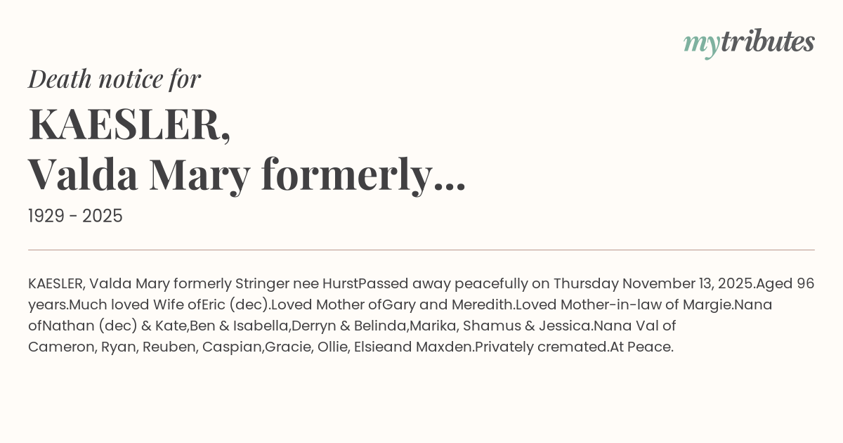 KAESLER, Valda Mary formerly Stringer nee Hurst