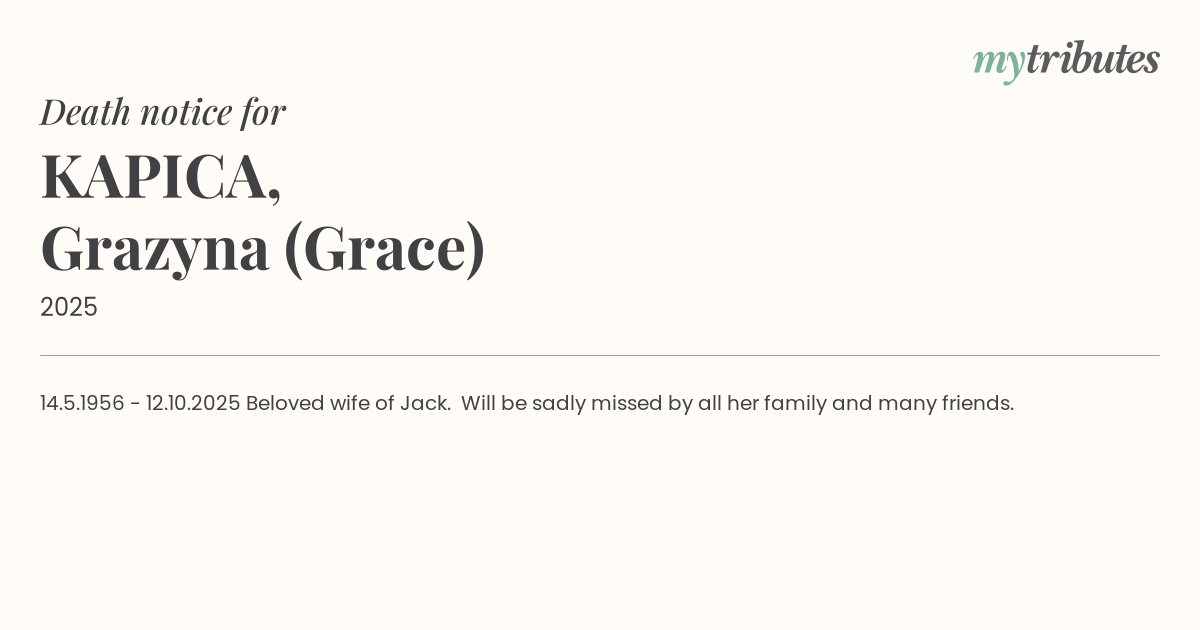 14.5.1956 - 12.10.2025 Beloved wife of Jack. Will be sadly missed by all her family and many friends.