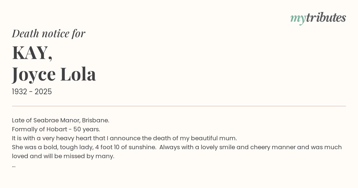 "Joycie" wife to Ian (dec). Mother to Lynette (dec) and Sandra (dec). She leaves her sole surviving daughter Heather and son-in-law Rod.
