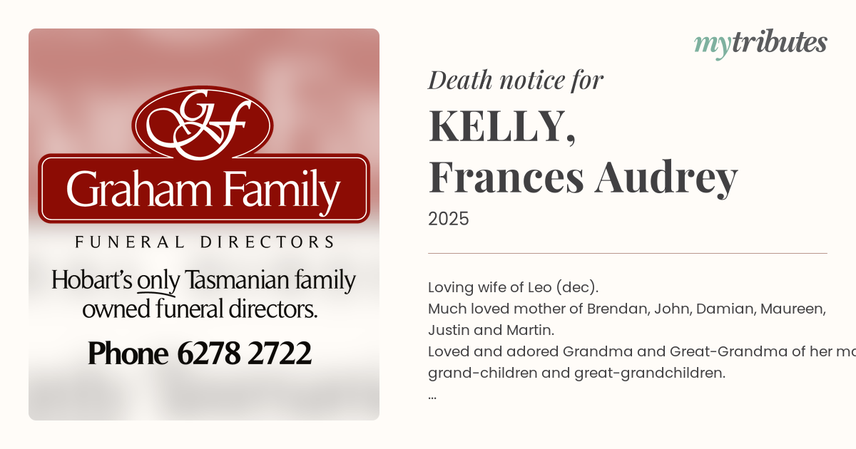 Much loved mother of Brendan, John, Damian, Maureen, Justin and Martin.