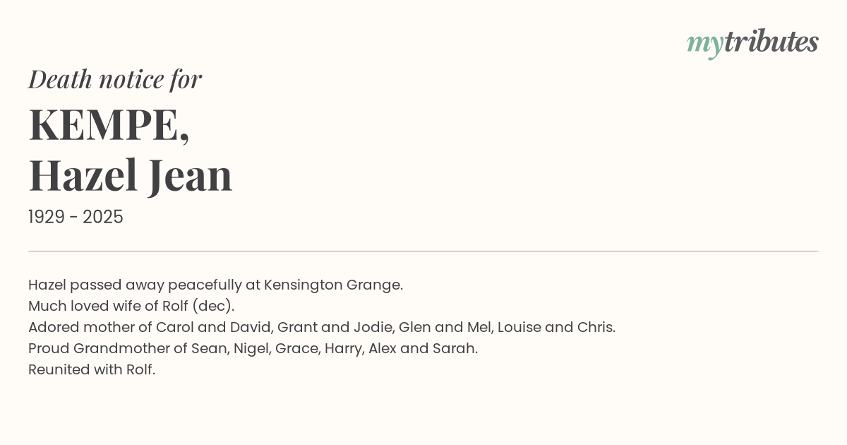 Hazel passed away peacefully at Kensington Grange. Much loved wife of Rolf (dec). Adored mother of Carol and David, Grant and Jodie, Glen and Mel, Louise and Chris. Proud Grandmother of Sean, Nigel, Grace, Harry, Alex and Sarah. Reunited with Rolf.