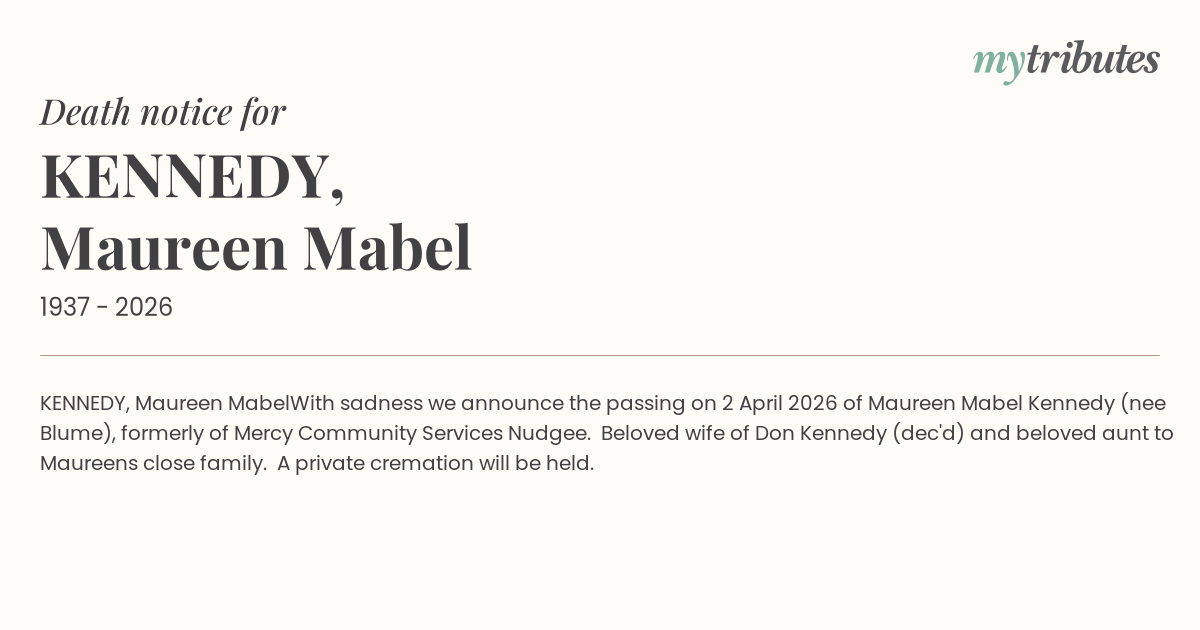 With sadness we announce the passing on 2 April 2026 of Maureen Mabel Kennedy (nee Blume), formerly of Mercy Community Services Nudgee. Beloved wife of Don Kennedy (dec'd) and beloved aunt to Maureen’s close family. A private cremation will be held.