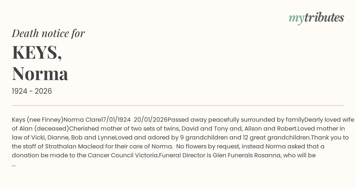 Funeral Director is Glen Funerals Rosanna, who will be publishing a separate Funeral Notice. Norma’s funeral will also be live streamed.