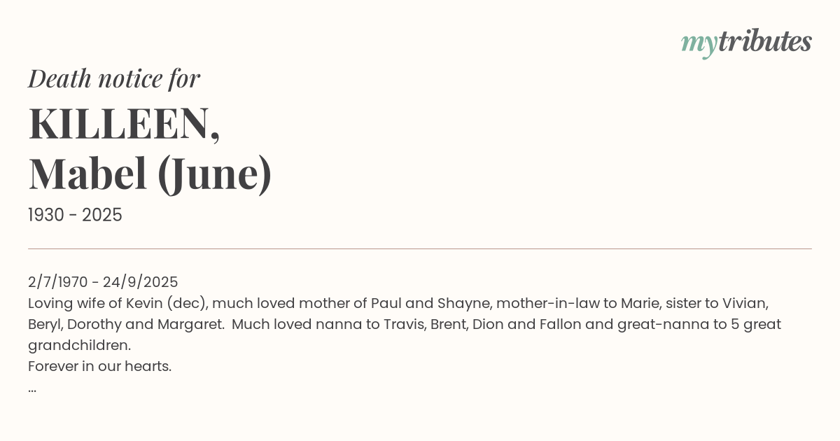 Loving wife of Kevin (dec), much loved mother of Paul and Shayne, mother-in-law to Marie, sister to Vivian, Beryl, Dorothy and Margaret. Much loved nanna to Travis, Brent, Dion and Fallon and great-nanna to 5 great grandchildren.