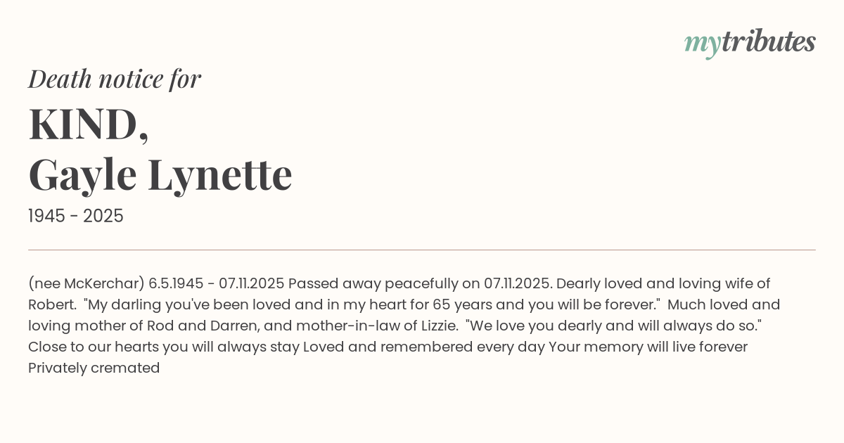 Much loved and loving mother of Rod and Darren, and mother-in-law of Lizzie. "We love you dearly and will always do so."