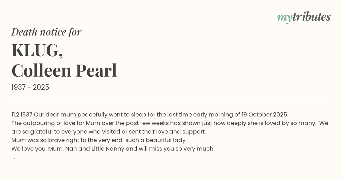 11.2.1937 Our dear mum peacefully went to sleep for the last time early morning of 19 October 2025. The outpouring of love for Mum over the past few weeks has shown just how deeply she is loved by so many. We are so grateful to everyone who visited or sent their love and support. Mum was so brave right to the very end — such a beautiful lady. We love you, Mum, Nan and Little Nanny and will miss you so very much. Donna, Janine, Mark, Robyn, Matt, Lochie, Jess, Thomas, Victoria, Harriet, Sarah, Richard, Ella & Mia.