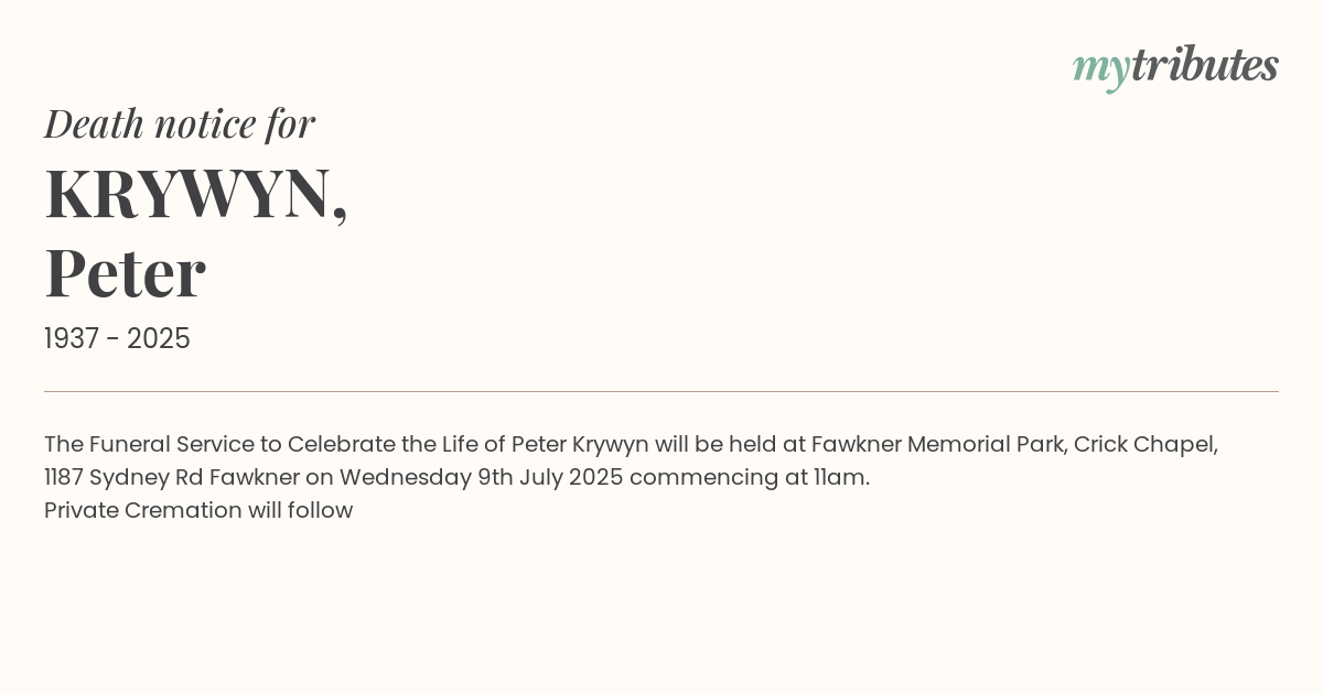 The Funeral Service to Celebrate the Life of Peter Krywyn will be held at Fawkner Memorial Park, Crick Chapel, 1187 Sydney Rd Fawkner on Wednesday 9th July 2025 commencing at 11am.