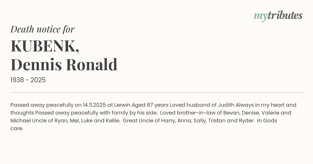 Passed away peacefully on 14.11.2025 at Lerwin Aged 87 years Loved husband of Judith Always in my heart and thoughts