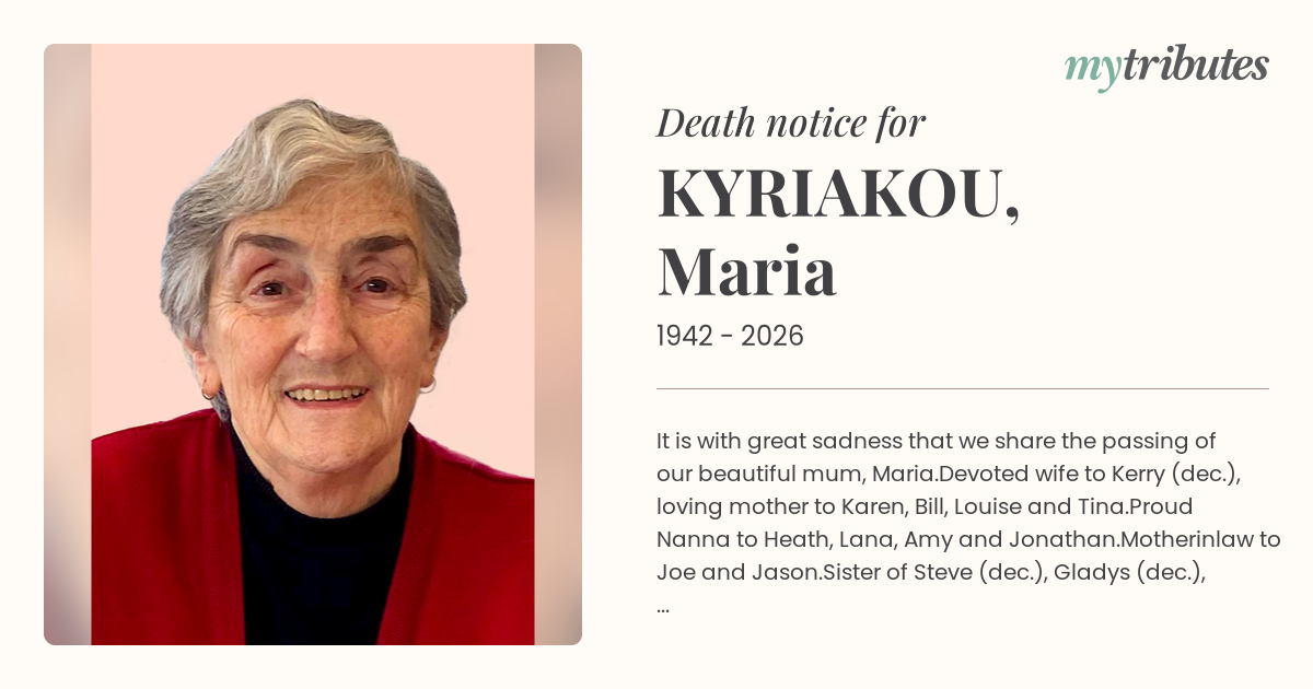 For funeral service and live stream details, please visit https://www.gardeniafunerals.com.au/view-tribute/maria-kyriakou-GF26060/