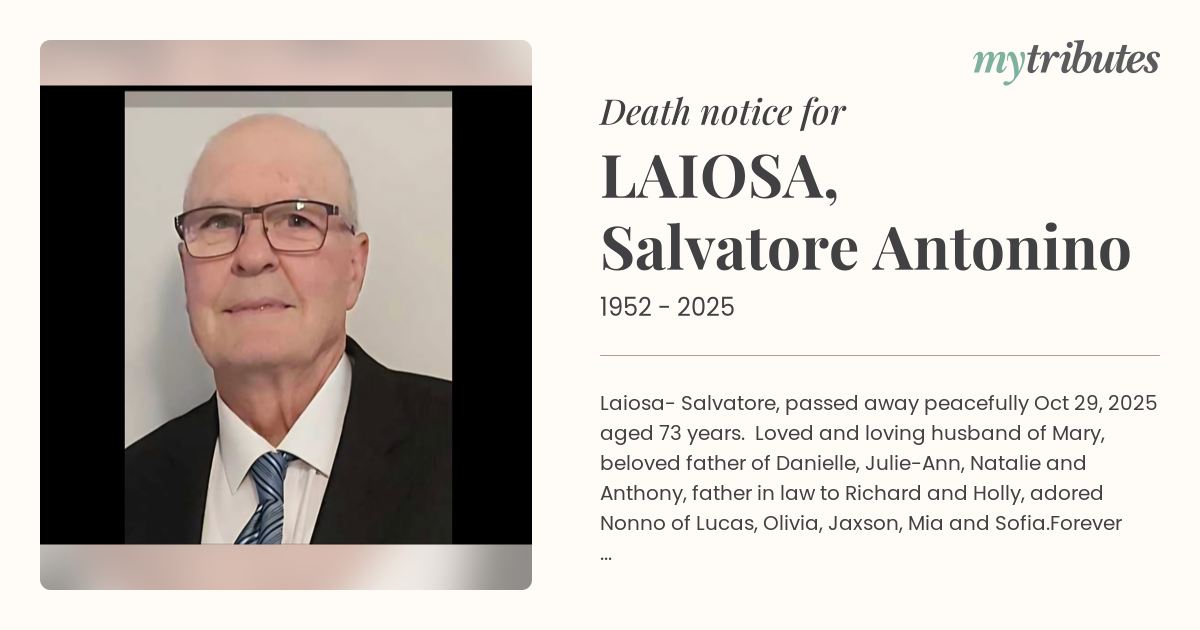 Laiosa- Salvatore, passed away peacefully Oct 29, 2025 aged 73 years. Loved and loving husband of Mary, beloved father of Danielle, Julie-Ann, Natalie and Anthony, father in law to Richard and Holly, adored Nonno of Lucas, Olivia, Jaxson, Mia and Sofia.