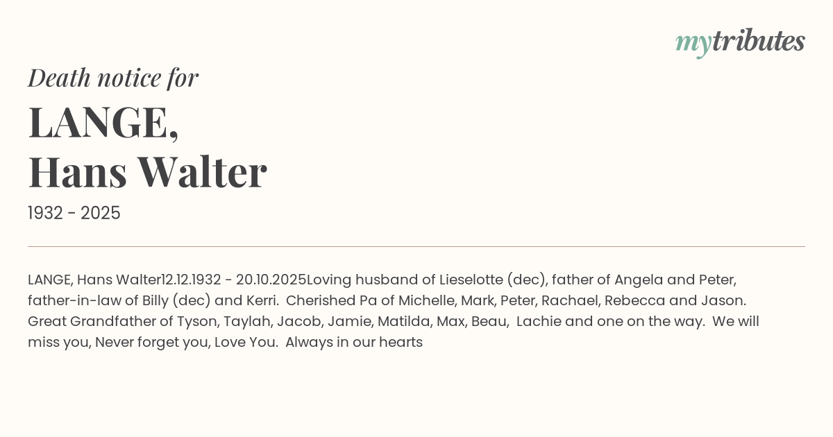 Loving husband of Lieselotte (dec), father of Angela and Peter, father-in-law of Billy (dec) and Kerri. Cherished Pa of Michelle, Mark, Peter, Rachael, Rebecca and Jason. Great Grandfather of Tyson, Taylah, Jacob, Jamie, Matilda, Max,