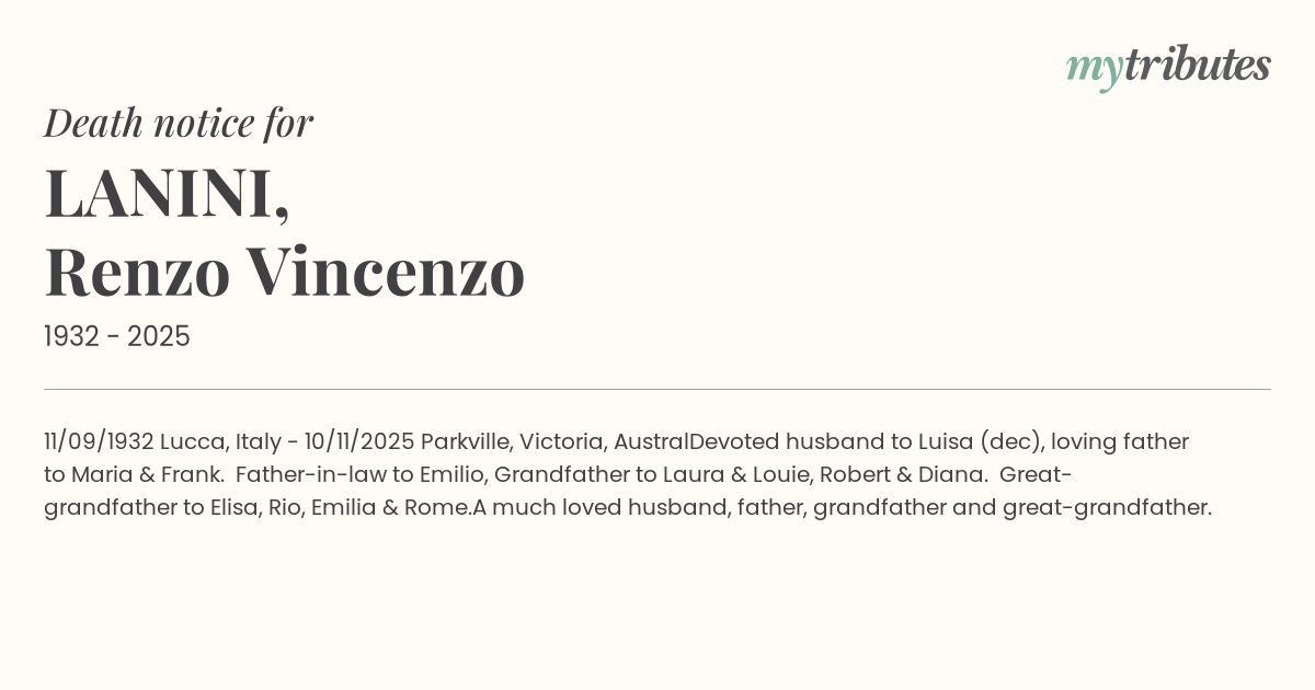 11/09/1932 Lucca, Italy - 10/11/2025 Parkville, Victoria, Austral