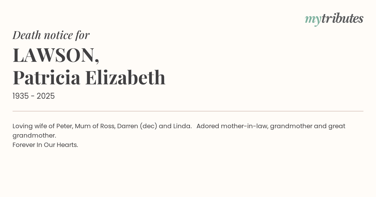 Loving wife of Peter, Mum of Ross, Darren (dec) and Linda. Adored mother-in-law, grandmother and great grandmother.