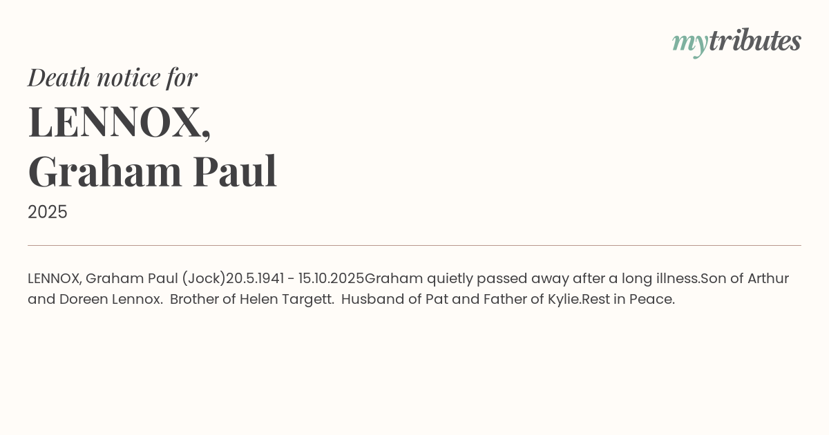 Son of Arthur and Doreen Lennox. Brother of Helen Targett. Husband of Pat and Father of Kylie.