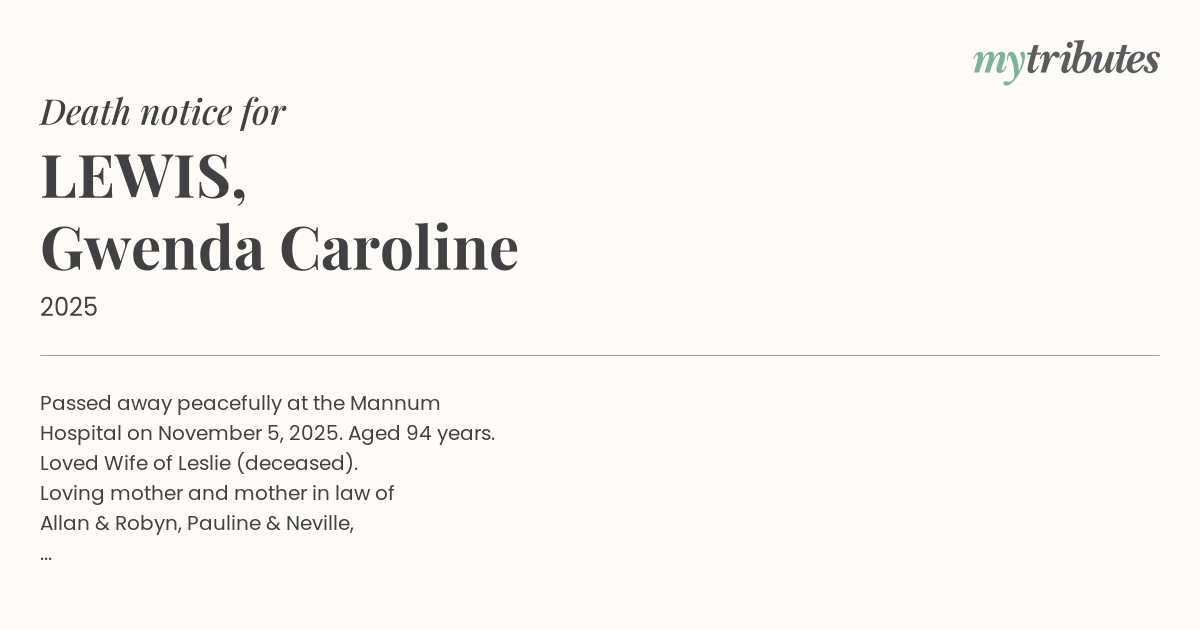 Nanna to 4 grandchildren and 8 great grandchildren.