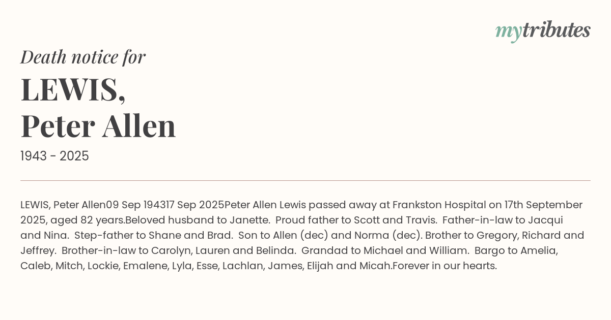 Peter Allen Lewis passed away at Frankston Hospital on 17th September 2025, aged 82 years.
