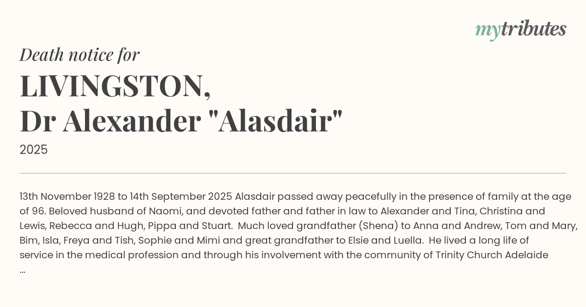 Alasdair passed away peacefully in the presence of family at the age of 96.