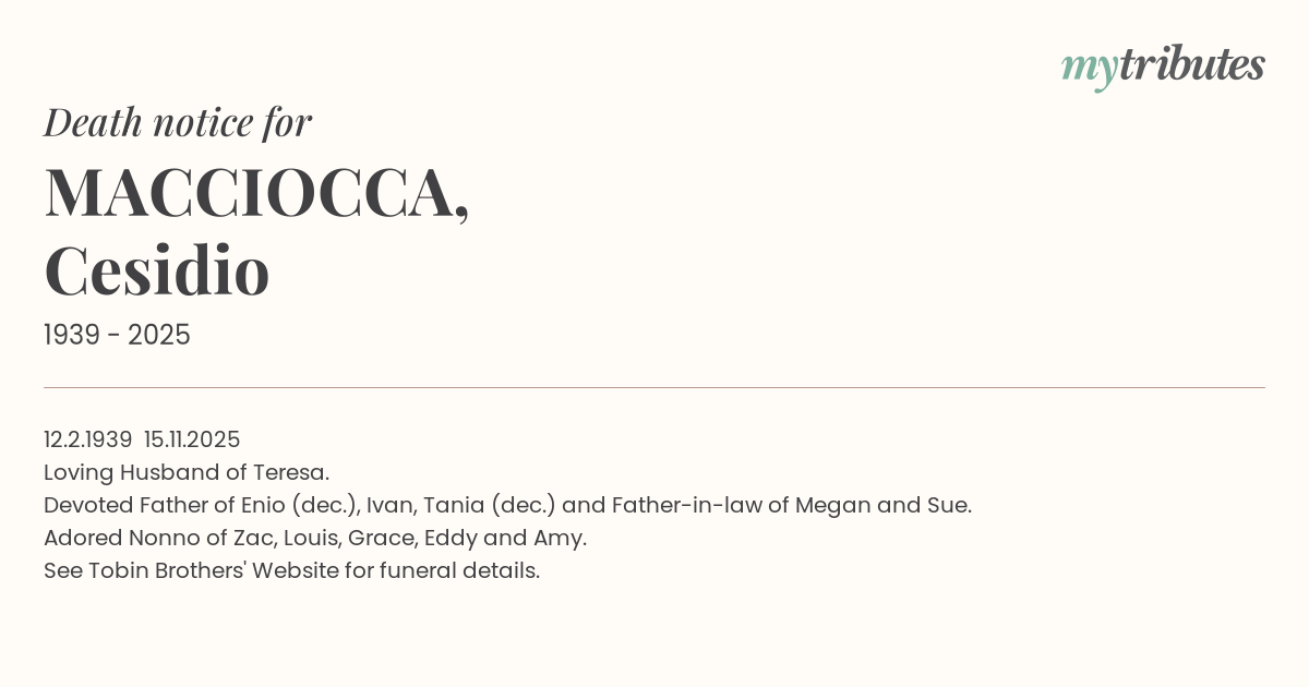 Devoted Father of Enio (dec.), Ivan, Tania (dec.) and Father-in-law of Megan and Sue.
