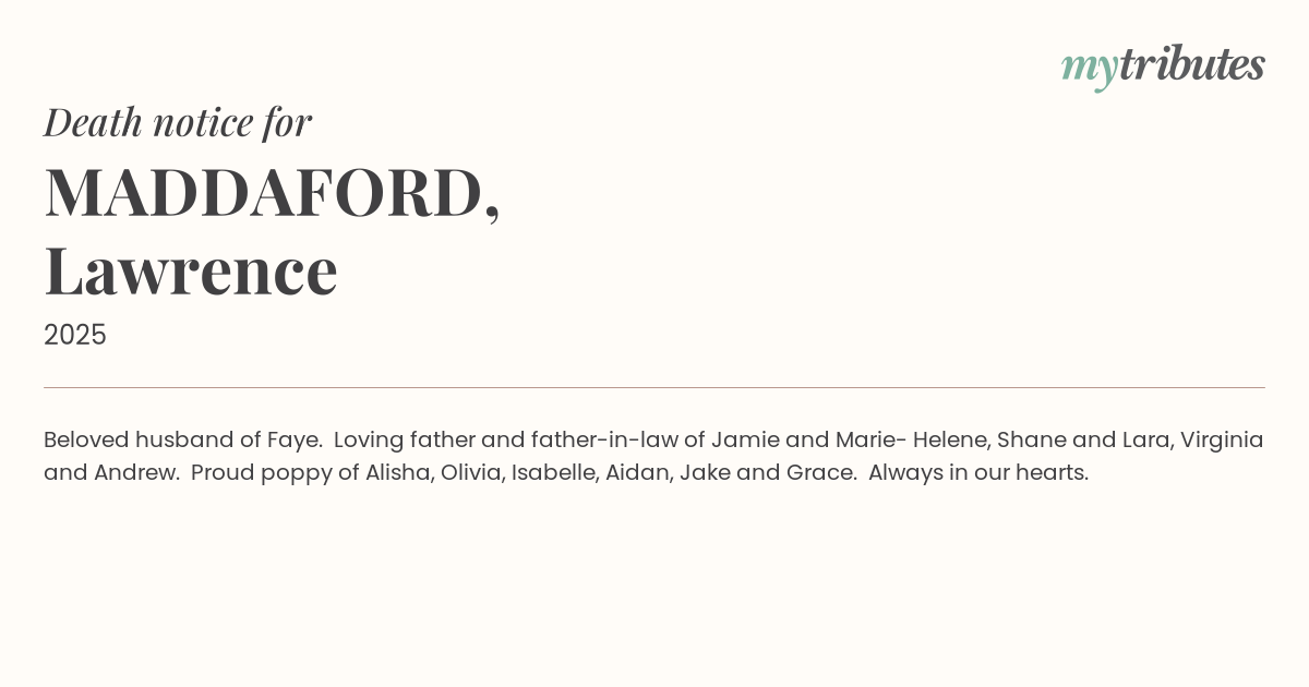Loving father and father-in-law of Jamie and Marie- Helene, Shane and Lara, Virginia and Andrew.