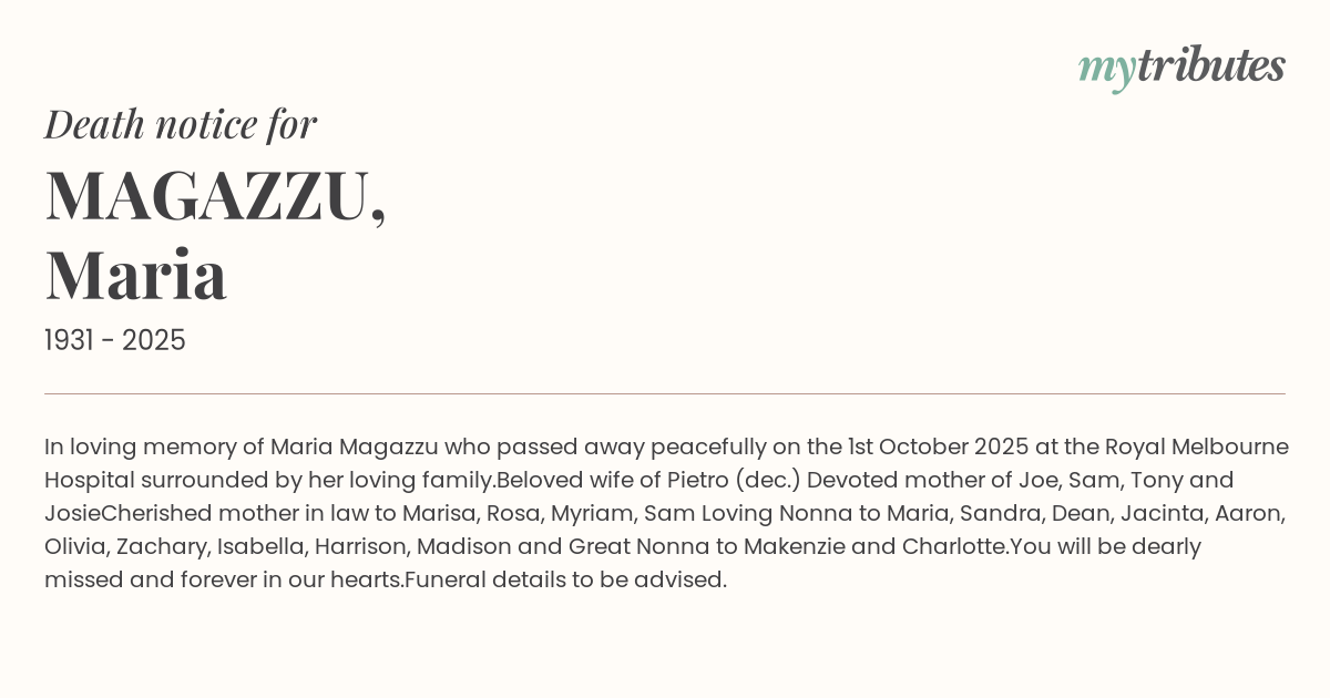 In loving memory of Maria Magazzu who passed away peacefully on the 1st October 2025 at the Royal Melbourne Hospital surrounded by her loving family.