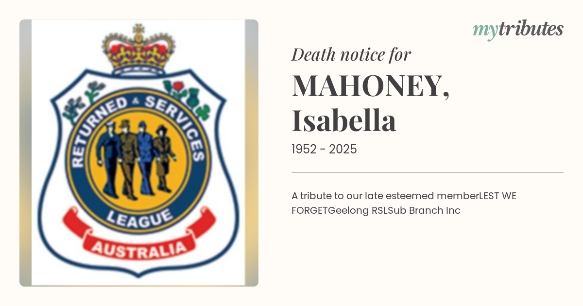 A tribute to our late esteemed memberLEST WE FORGETGeelong RSLSub Branch Inc