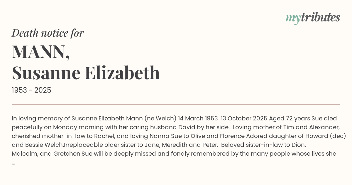 In loving memory of Susanne Elizabeth Mann (née Welch)