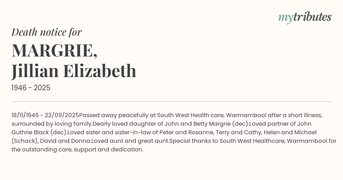 Dearly loved daughter of John and Betty Margrie (dec).