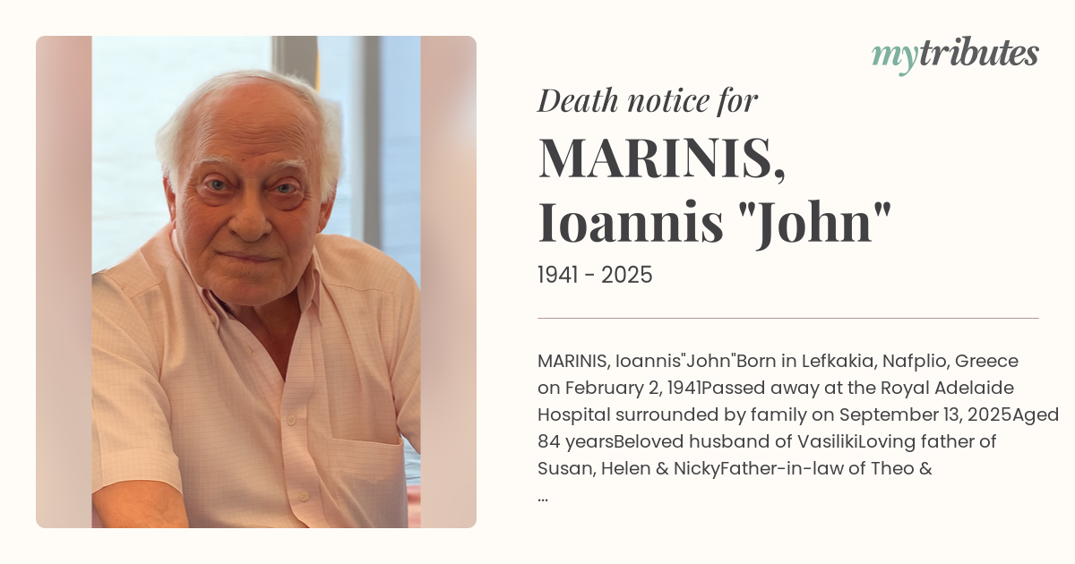 John will be sadly missed by all his family and friends in Australia and Greece.