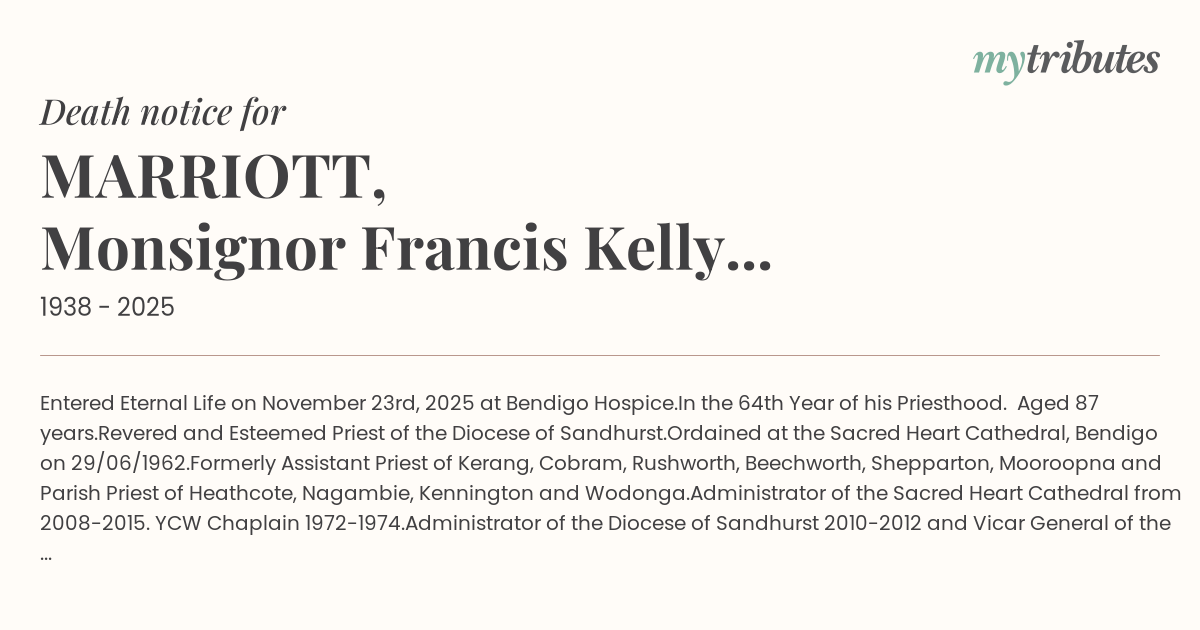 Formerly Assistant Priest of Kerang, Cobram, Rushworth, Beechworth, Shepparton, Mooroopna and Parish Priest of Heathcote, Nagambie, Kennington and Wodonga.
