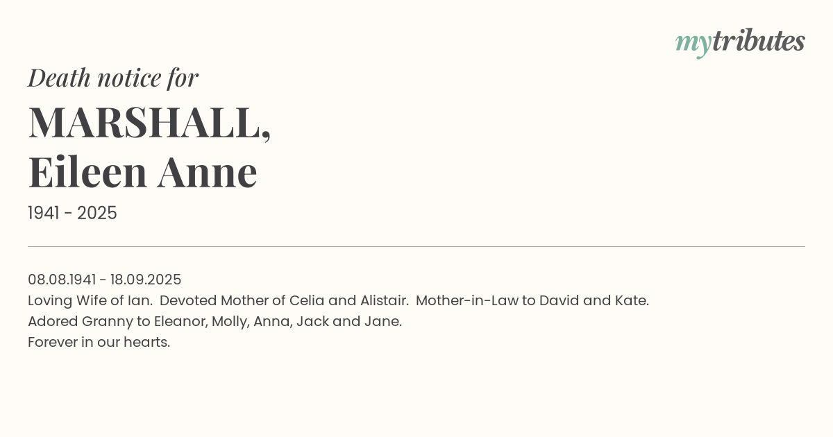 Loving Wife of Ian. Devoted Mother of Celia and Alistair. Mother-in-Law to David and Kate.