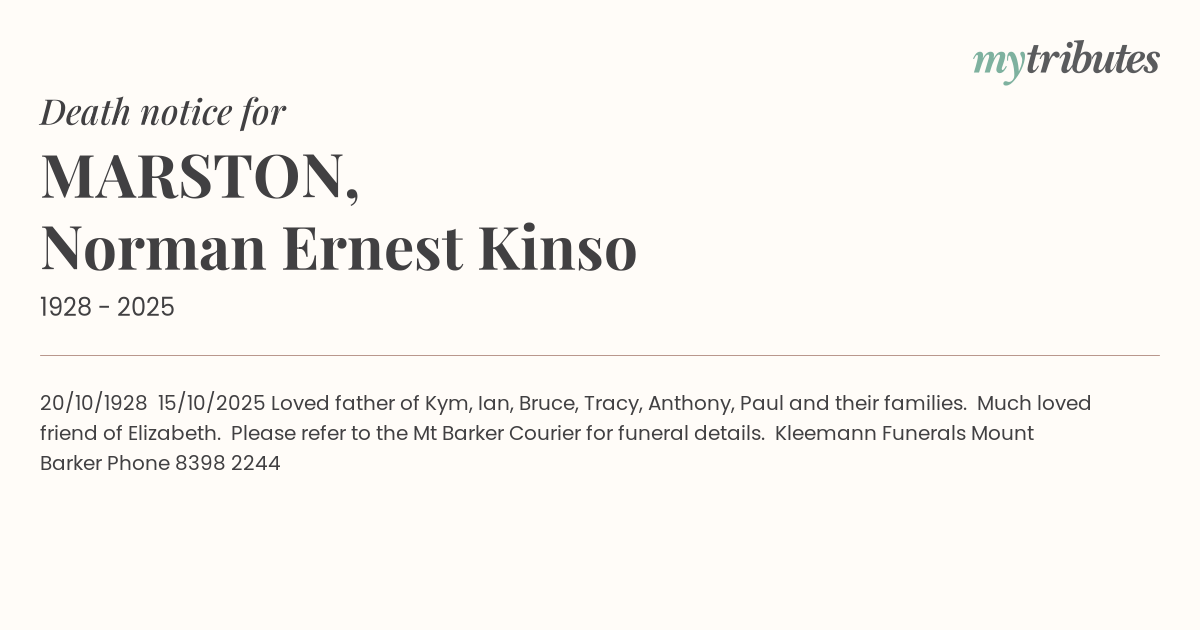 20/10/1928 – 15/10/2025 Loved father of Kym, Ian, Bruce, Tracy, Anthony, Paul and their families. Much loved friend of Elizabeth. Please refer to the Mt Barker Courier for funeral details. Kleemann Funerals Mount Barker Phone 8398...