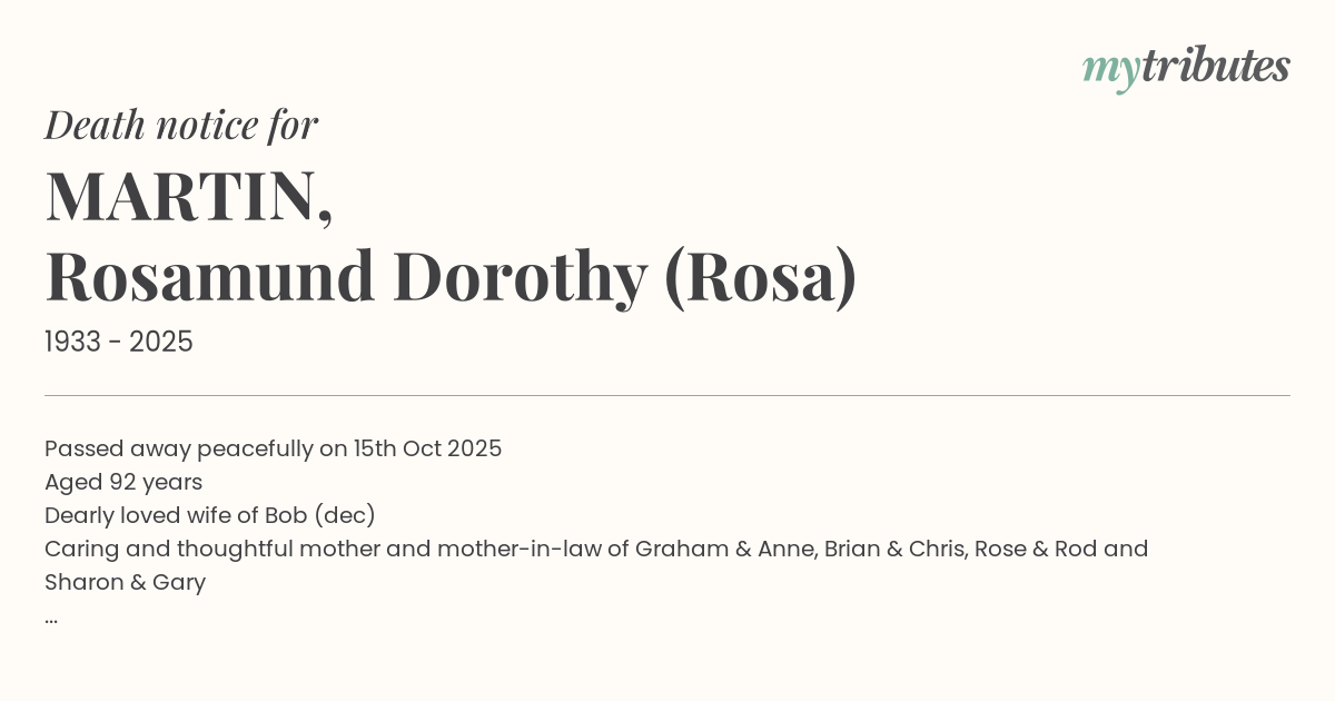 Passed away peacefully on 15th Oct 2025 Aged 92 years Dearly loved wife of Bob (dec) Caring and thoughtful mother and mother-in-law of Graham & Anne, Brian & Chris, Rose & Rod and Sharon & Gary Treasured Grandma of 8 grandchildren and their partners and 9 great-grandchildren